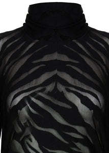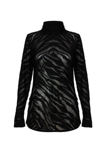 Elevate your style with Kozan's Mesh Max Top, showcasing a softly ruched turtleneck and sleeve thumbholes. The on trend fashion forward black zebra print, created by the designer, adds a touch of classic sophistication to this edgy top. Ruching on the sides adds a flattering touch to this pullover, making it an ideal addition to any outfit. Slightly sheer.